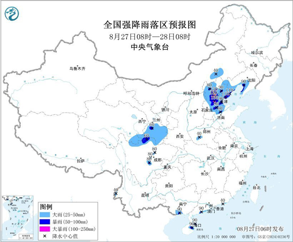 據中央氣象臺消息,8月27日08時至28日08時,內蒙古東南部、遼寧西南部、河北大部、北京、天津、山東北部、青海南部、甘肅中南部、川西高原北部、四川盆地西部和南部以及廣西南部沿海、廣東南部沿海、海南島等地部分地區有大到暴雨,其中,河北中部和東北部、北京西南部等地局地有大暴雨(100~130毫米),上述部分地區伴有短時強降水(最大小時降雨量20~50毫米,局地可超過70毫米),局地有雷暴大風等強對流天氣。